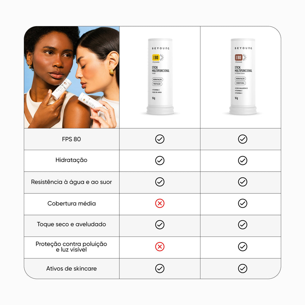 Cor, cuidado e proteção em um único gesto. O Stick Bastão Multifuncional com Cor FPS 80 da Beyoung foi desenvolvido para facilitar sua rotina sem abrir mão da eficácia.