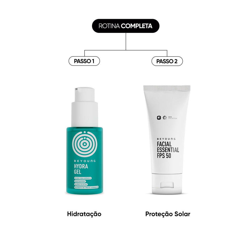 Após a limpeza da pele, existem dois passos indispensáveis: a hidratação e a proteção solar. Incluir na rotina esses dois hábitos simples vai garantir uma pele muito mais saudável e viçosa. Para o passo de hidratação, o Hydra Gel entrega textura ultraleve que não pesa na pele, rápida absorção e hidratação profunda. Já no momento de proteção, o Facial Essential FPS 50 garante proteção solar com uma textura gel transparente e acabamento aveludado, sem deixar resíduos na pele.