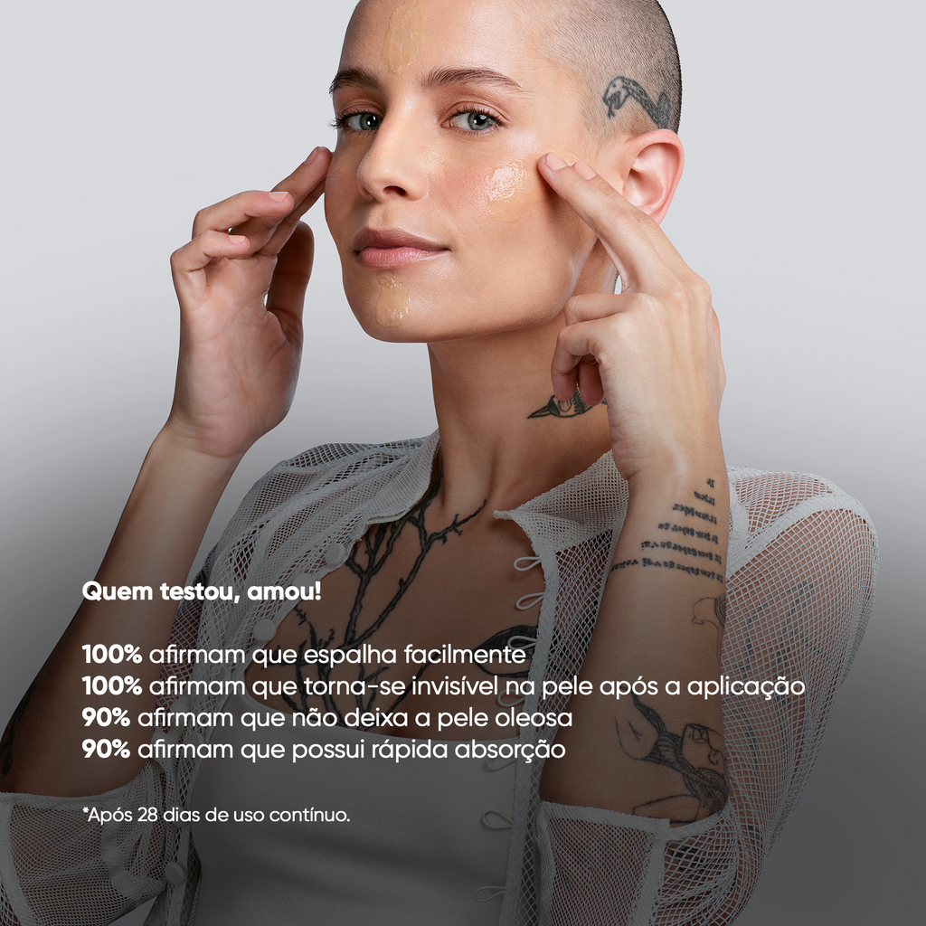Protetor solar de uso diário que combina filtros eficientes, estáveis e potentes, oferecendo tripla proteção: contra raios UVA, UVB e poluição: principais causadores de danos como queimaduras solares, manchas e alterações na estrutura da pele.